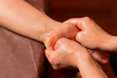 オイルを使ってヒジ下~手のひらの【反射区】を刺激した後、デコルテ・肩首・肩甲骨・頭周りをほぐします。