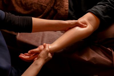オイルを使ってヒジ下~手のひらの【反射区】を刺激します。
