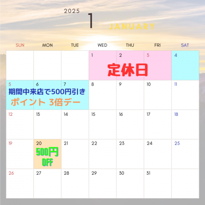 1月のイベント& 定休日のお知らせを致します(^^♪